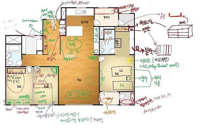 1층의 단점을 보완하며 저희만의 라이프스타일에 맞게 가구들과 가전제품들을 배치해 놨던 사진이에요. 포토샵이 없어 손수 그려 정신도 없고, 중간에 바뀌는 부분도 많았던 지라 참고용으로 봐주시길 바래요.