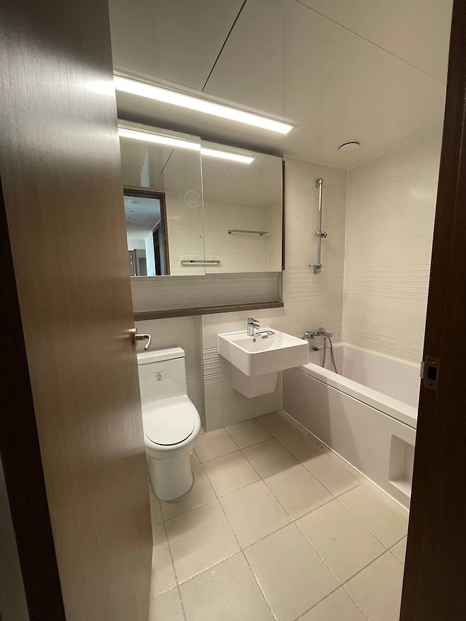 이곳은 안방에 위치한 욕실입니다. 일반 욕실과 다르게 유리 벽면과 세면대, 변기 위치가 달랐어요.