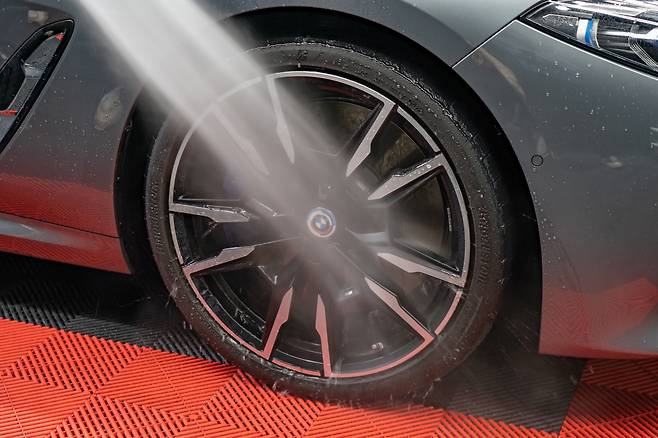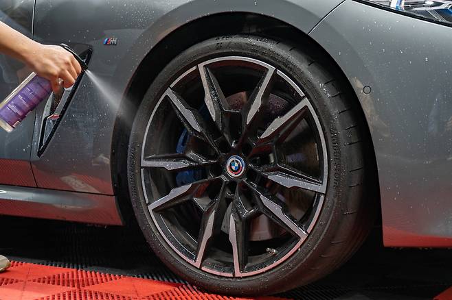 본격적인 세차에 앞서 사용해야 하는 제품은 ‘철분제거제’다. 주행을 하다보면, 브레이크 패드와 디스크 로터의 마찰로 생기는 철분가루가 달라붙어 오염이 발생한다. 이러한 오염물질을 장시간 방치할 경우 도장면을 부식시킬 수 있어 정기적인 관리가 필요하다.