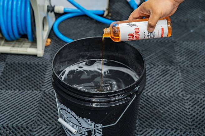 준비한 버킷에 깨끗한 물을 3/5 가량 넣고 카샴푸를 적당히 덜어낸 다음, 고압수 건을 버킷 안쪽으로 분사해 거품을 만들어준다. 그 다음 워시미트 또는 세차용 스펀지를 담가 활용한다.