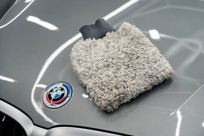두 번째 필수 용품은 워시미트(또는 세차용 스펀지). 오늘 소개할 제품은 ‘퓨어스타 더블 트위스트 워시미트’로, 장갑처럼 손을 넣어 양면으로 편하게 사용할 수 있는 제품이다. 도장면 흠집을 최소화할 수 있는 초극세사 소재로 만들었으며, 취향에 따라 손을 넣지 않는 타입으로 구입해도 무방하다.