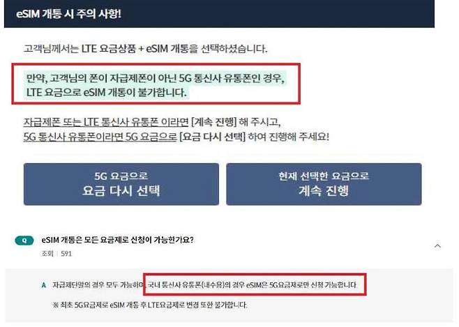 SK텔레콤·KT·LG유플러스 등 이동통신 3사에서 구입한 5G 스마트폰은 eSIM(이심, 내장형 가입자식별모듈)을 이용한 LTE 알뜰폰 개통이 불가능한 것으로 확인됐다. 이달 국내 이심 정식 서비스 도입을 맞아 '이통사 5G+알뜰폰 LTE' 사용을 고려했던 소비자라면 주의가 요구된다. 이통사향이 아닌 이심이 장착된 자급제폰(공기계)은 '이통사 5G+알뜰폰 LTE'의 조합이 가능하다.