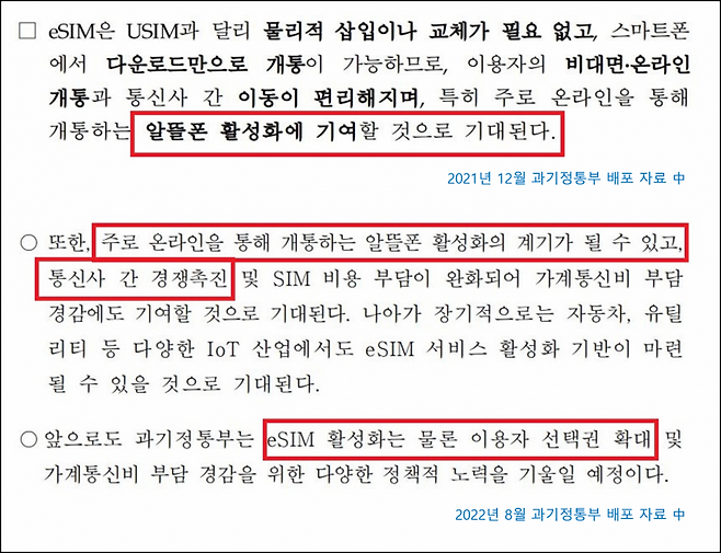 문제는 이런 시스템이 정부의 이심 도입 취지와 충돌한다는 점이다. 과학기술정보통신부(이하 과기정통부)는 지난해와 올해 2차례 배포한 정책 설명 자료에서 '이심 도입 시 알뜰폰 시장 활성화 및 이통사 간 경쟁 촉진, 이용자 선택권 확대' 등을 도입 효과로 기대한 바 있다. 국내 미디어들도 양질의 고객 서비스를 제공하는 이통사 회선과 저렴한 가격에 다량의 데이터를 제공하는 알뜰폰 회선 조합의 시너지 효과를 집중 조명했다.