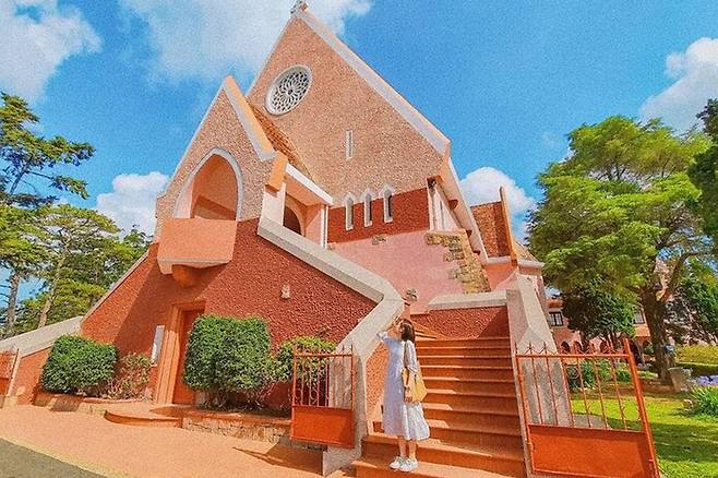 달랏대성당은 성당 꼭대기에 수탁모양의 동상이 있는데요. 분홍빛을 띄고 있는 달랏대성당 역시 이곳의 랜드마크로 유명하죠.