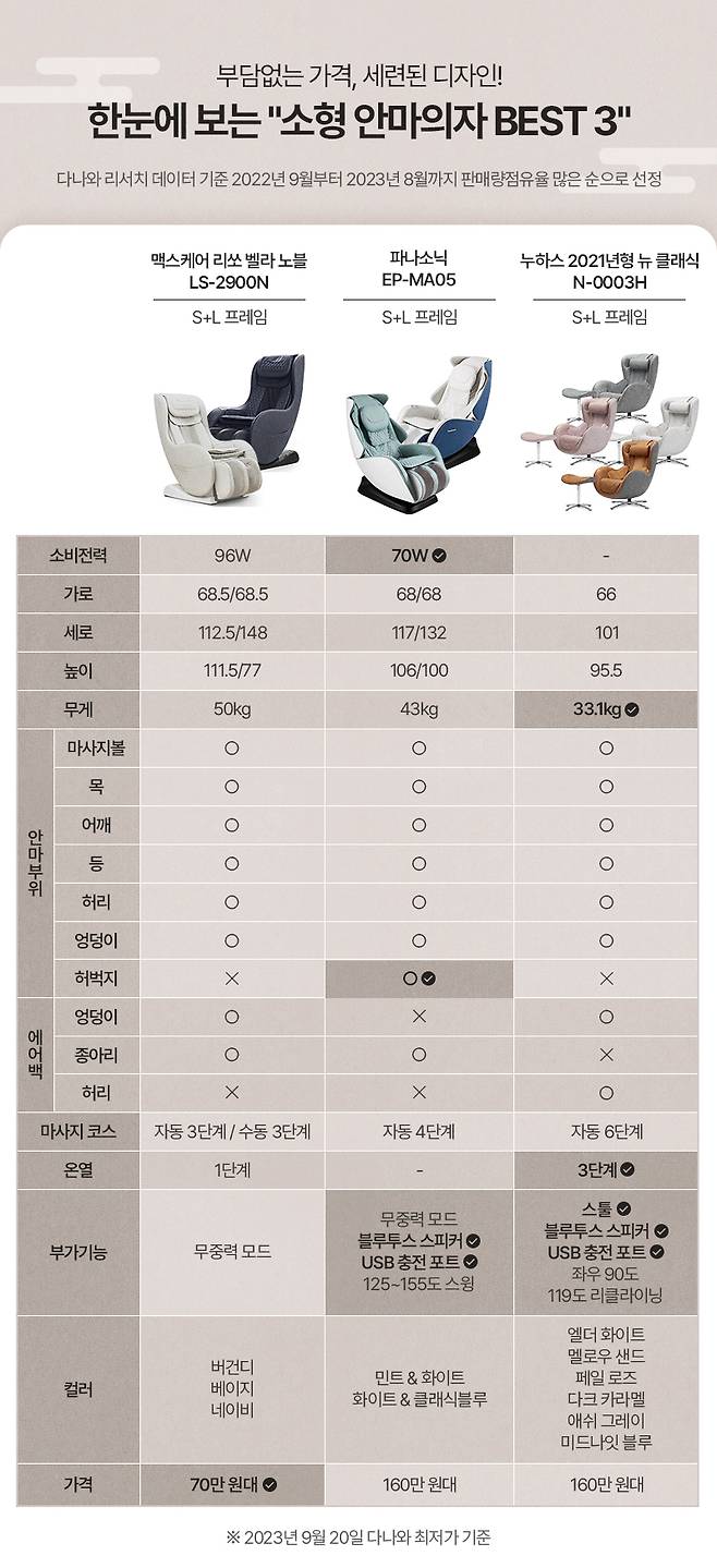 Top 3 중 1위는 지난 1년간 소형 안마의자 부문 판매량 점유율 22.27%를 차지한 맥스케어 리쏘 벨라 노블 LS-2900N<695,300원>이다. 이 제품의 특징은 첫 번째도 가격, 두 번째도 가격, 세 번째도 가격이다. 100만 원을 훌쩍 넘는 다른 제품들에 비해 무려 70만 원도 안 되는 가격으로 구입할 수 있다. 스펙 카드에서도 볼 수 있듯이, 2, 3위 제품의 반도 안 되는 가격임에도 마사지 부위, 에어백은 거의 비슷한 수준이며 무중력 모드를 지원해 편안한 수면도 가능하다. 가성비에 초점을 두어 부담 없이 부모님을 위해 선물할 수 있는 인기 제품이다.