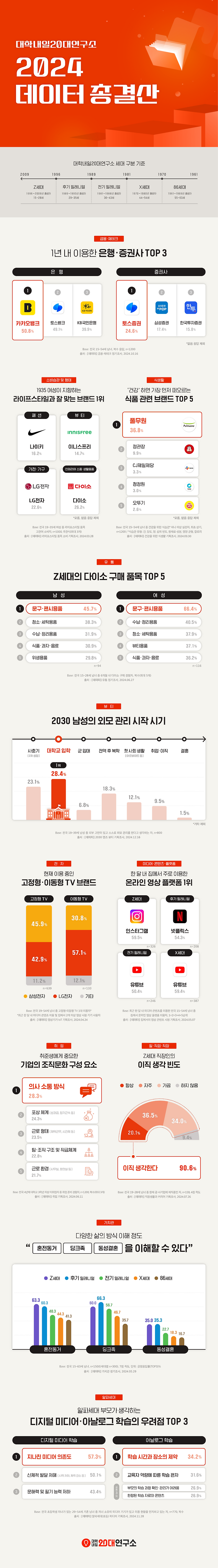 이 밖에도 대학내일20대연구소의 ‘2024 주요 데이터 총결산’ 인포그래픽에서는 사람들이 최근 한 달 내 집에서 이용한 온라인 영상 플랫폼, 현재 이용 중인 고정형 TV 브랜드 등 흥미로운 데이터가 담겨 있습니다. 연간 발행된 연구자료를 통해 주제별 상세 데이터를 파악할 수 있습니다.