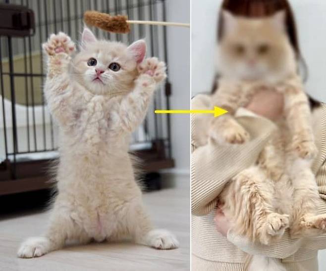 사연은 이렇습니다. SNS상에는 같은 고양이가 맞나 두 눈을 의심하게 할 정도로 확 자란 아기 고양이의 전후 비교샷이 올라와 눈길을 끌어 모았죠.