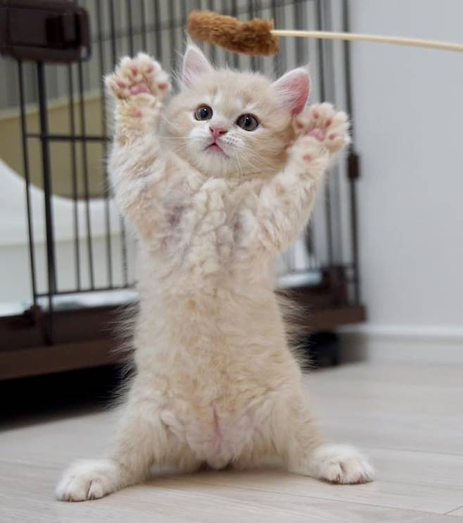 누가 봐도 너무 귀엽고 사랑스러운 아기 고양이. 무엇보다도 특히 짤막한 다리로 장난감을 잡아보겠다며 쭉 뻗고 있는 모습이 매우 인상적인데요.