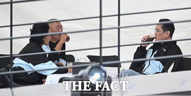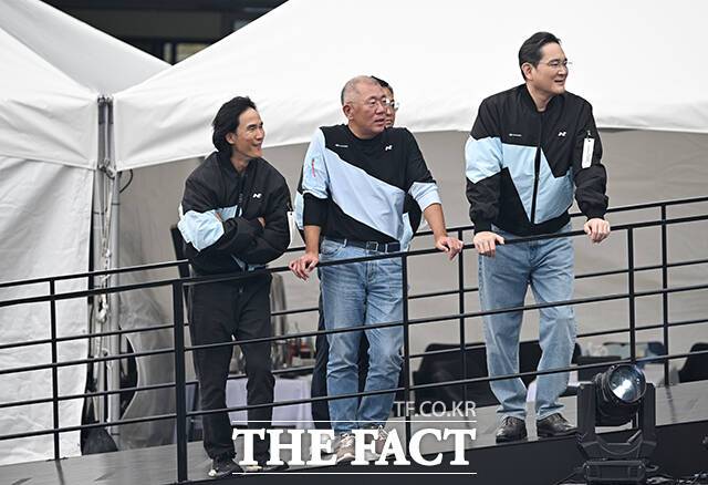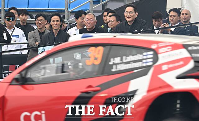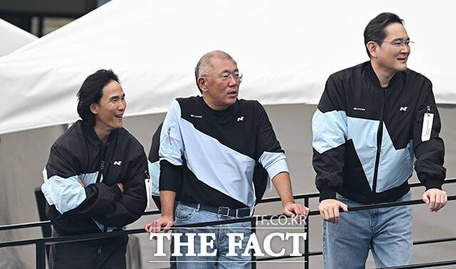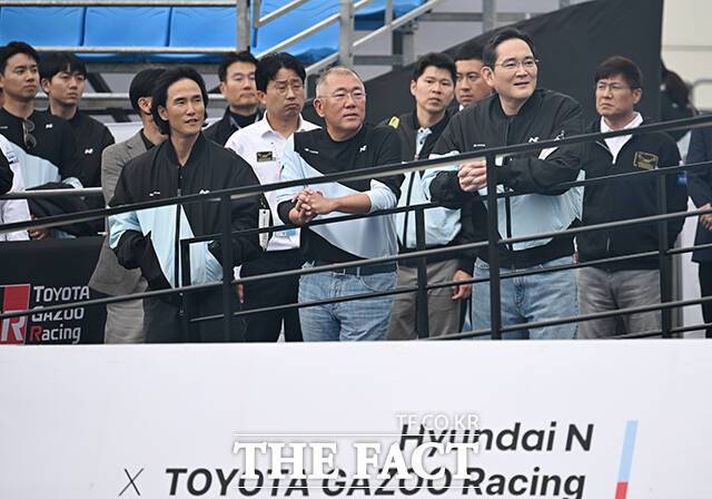 [더팩트|용인=박헌우 기자] 조현범 한국앤컴퍼니 회장과 정의선 현대자동차그룹 회장, 이재용 삼성전자 회장(왼쪽부터)이 27일 오후 경기 용인시 에버랜드 스피드웨이에서 열린 '현대 N x 토요타 가주 레이싱 페스티벌'에 참석해 리허설을 지켜보고 있다.