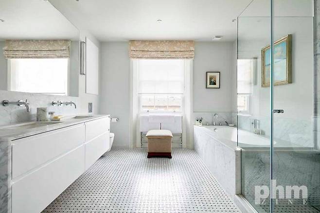 화장실 바닥은 패턴이 있는 대리석으로 단순히 고급스러운 느낌이 대신 재미를 더한 모던함을 강조했다. Mandarin Stone으로 Geometric Cube Decor를 활용해 착시 현상을 일으키는 플로어 아트다.