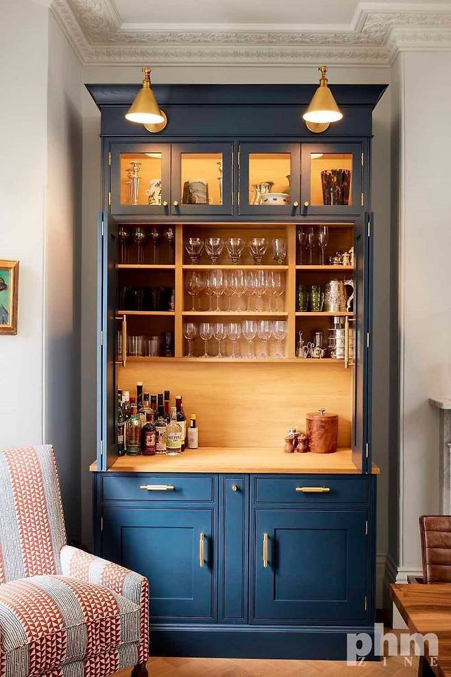 수납장 내부에 설치된 라이트는 컵과 여러 주방 용품들을 마치 갤러리의 작품처럼 보이도록 한다. 평상시에 문을 닫아놓고 있어야 한다는 사실이 아쉽게 다가온다.