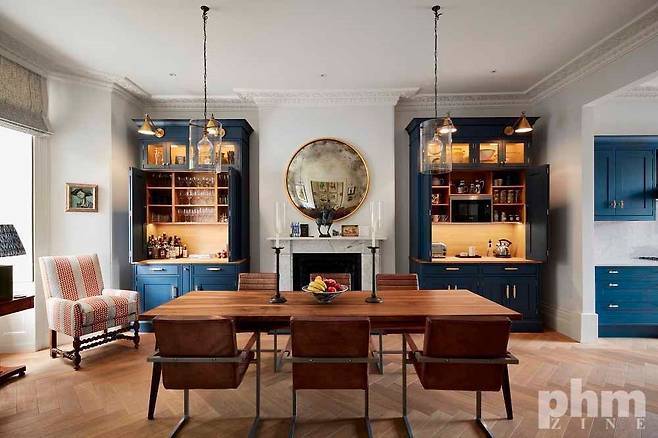 주방과 거실 공간은 이런 주택의 콘셉트와 성격을 보여주는 함축적인 공간이다. 거울이 있는 벽난로를 중심으로 좌우 대칭을 이루는 디자인을 했다. 이런 대칭 배치와 가구의 조화는 격식과 안정감을 공간에 더한다. 같은 모양과 컬러의 가구가 영국 옛 귀족들이 생활하던 공간을 연상시키기도 한다.