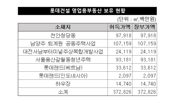 정부가 2017년 고고도미사일방어체계(THAAD) 시설 배치를 위해 롯데그룹이 보유한 경북 성주의 골프장(148만㎡)과 교환한 토지다. 롯데상사가 보유하던 부지 일부를 롯데건설이 2021년 매입해 공동주택 개발을 추진했으나 4년 넘게 사업이 이뤄지지 않고 있다. 퇴계원 부지의 장부가는 1071억원이다. 자산 가치 재평가를 통해 매각 대상에 포함될 가능성이 있다.