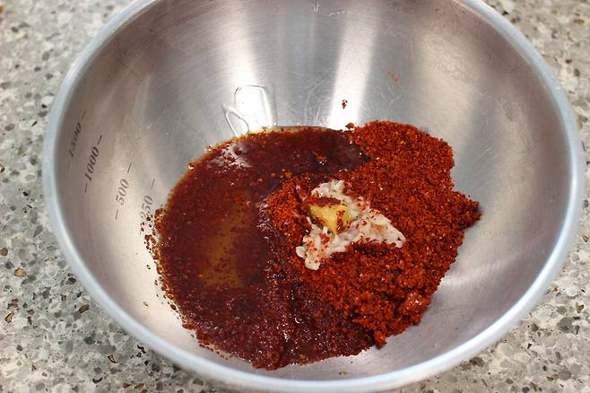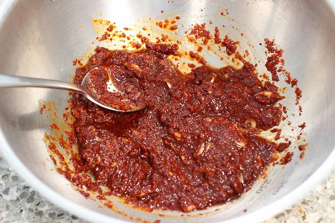잘 섞어둡니다. 그럼 고춧가루가 불어나면서 처음보다 뻑뻑해지는 느낌일거예요.