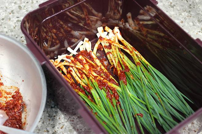 쪽파 물기가 다 사라졌다면 김치통에 예쁘게 담고 양념을 적당량 묻혀요. 초록 줄기 보다는 하얀 뿌리 쪽에 양념이 더 많이 묻어야 골고루 잘 익는답니다.