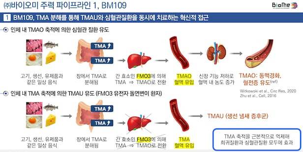 바이오미의 두 번째 후보 물질 BM109는 TMAO(트리메틸아민 N-옥사이드) 농도를 낮추는 치료제다. TMAO는 혈관에 동맥경화를 유발하고 혈전증을 일으켜 심혈관질환을 발생시키는 물질이다. 심혈관 질환자가 많은 미국에서는 혈액검사 항목에 TMAO 수치를 포함시키는 서비스가 등장했다. 건강한 삶을 위해 꼭 관리해야 하는 물질로 꼽힌 셈이다.
