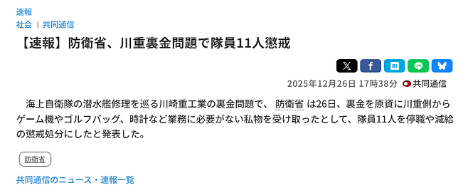 일본 카와사키 중공업이 1988년부터 2021년까지 무려 30년 넘게 잠수함용 디젤 엔진의 연비 성능 데이터를 조작해온 사실이 적발됐습니다. 여기에 별도로 유지보수 계약을 이용한 뒷돈 조성, 해상자위대원 금품 제공 스캔들까지 터졌는데요. 일본 방위성이 내린 처분은 고작 2.5개월(75일) 입찰 자격 정지였습니다.
