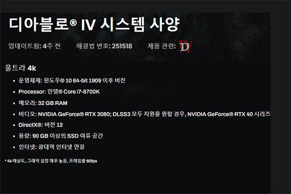 예를 들어 지난 2023년 6월 6일 출시된 디아블로4의 권장사양은 4K 기준 인텔 코어 i7-8700K에 32GB RAM, 그리고 RTX 3080 혹은 RTX 40 시리즈와 같은 DLSS 3 지원 그래픽카드, 거기에 고해상도 에셋을 위한 최소 130 GB SSD가 필요하다.