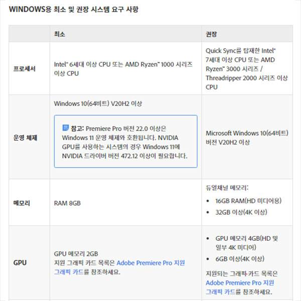 마지막은 영상 편집 프로그램을 위한 권장사양이다. 다양한 영상 편집 프로그램이 있지만, 이번 시간에는 프리미어 프로를 기준으로 사양을 잡았다. 프리미어 프로의 권장 사양은 퀵 싱크를 탑재한 7세대 이상 인텔 CPU와 32GB R4AM, 그리고 메모리 6GB 이상을 탑재한 그래픽카드와 SSD다.