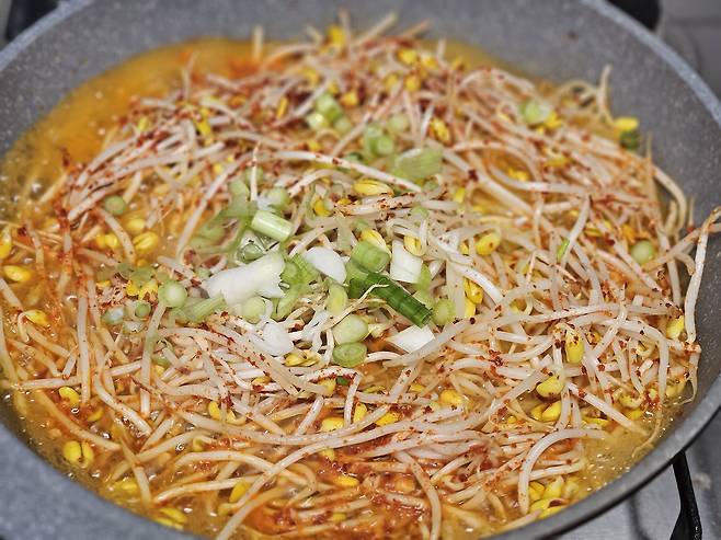 센불로 끓이다가 콩나물의 숨이 죽으면 대파를 넣고 약불로 줄여줍니다.
