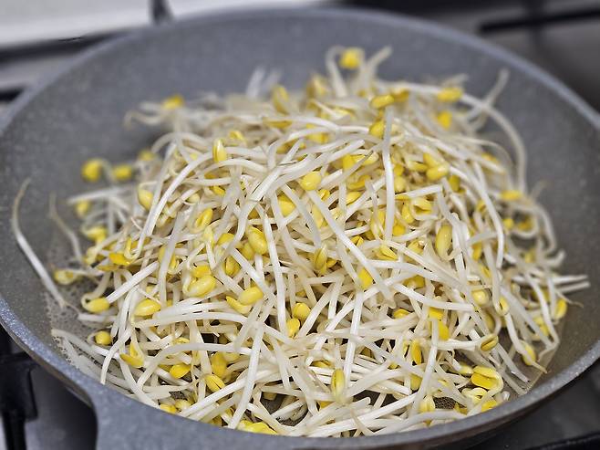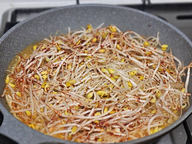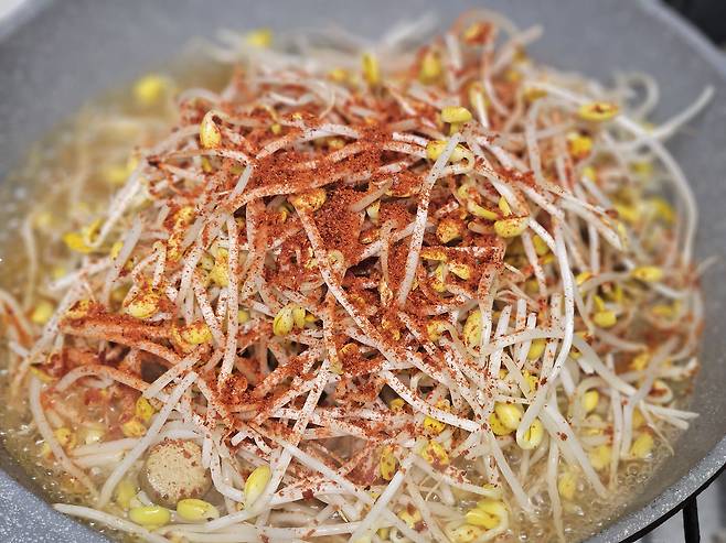 콩나물은 흐르는 물에 두세 번 헹궈서 체에 받쳐 물기를 빼주세요. 후라이팬에 콩나물을 넣고, 종이컵으로 물 한컵을 넣어주세요. 국물이 있는 콩나물 볶음을 만들고 싶으면 물양을 조금 더 넣어주셔도 괜찮아요.