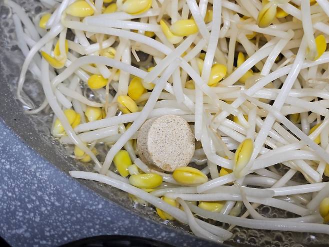 코인육수 한알 넣고 센불에 콩나물을 끓어주세요. 비린내가 날 수 있으니 뒤적이지 않고 그대로 끓여줍니다.