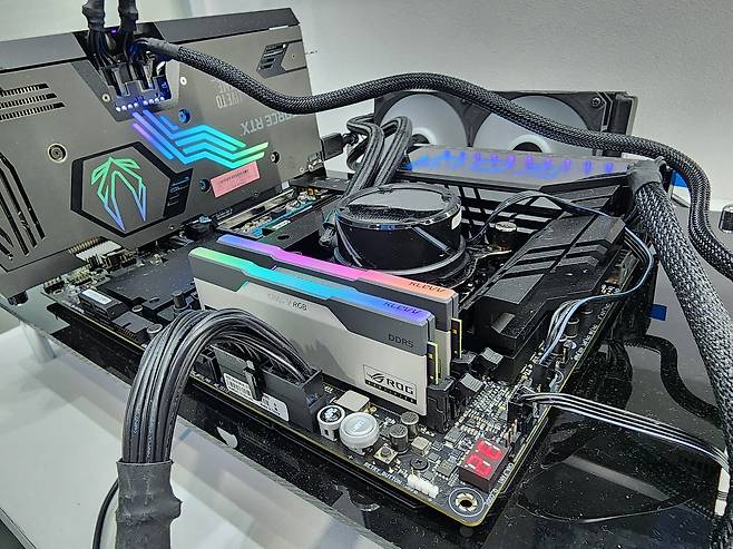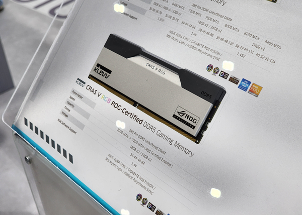 ASUS ROG와의 협업으로 만든 CRAS V RGB ROG Certificate 메모리도 이곳에 전시되어 있었다. 7000MT/s를 지원하는 DDR5 메모리로, CRAS V를 기반으로 만들어진 만큼 소프트웨어를 통해 RGB 제어를 손쉽게 할 수 있다.