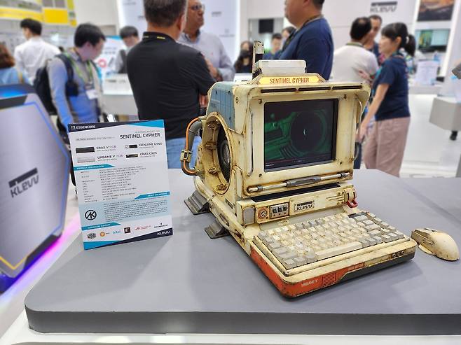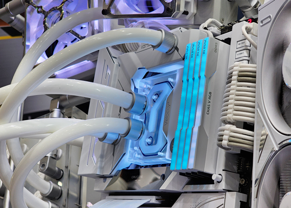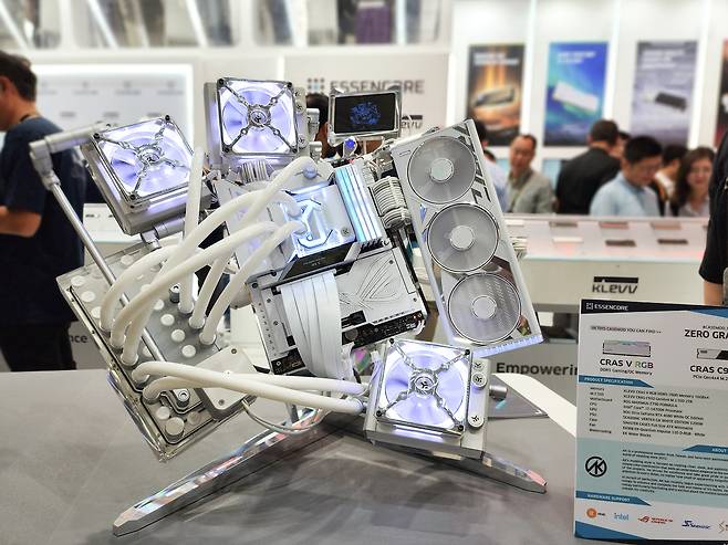 부스에서 관람객의 가장 많은 이목을 끌었던 것은 에센코어 클레브의 메모리와 SSD를 탑재한 컨셉 PC 시스템이었다. 마치 로봇을 보는 듯한 화이트 커스텀 튜닝 시스템에는 에센코어 클레브의 DDR5 7600MHz CRAS V RGB(크라스 V RGB) 메모리가 탑재되었다.