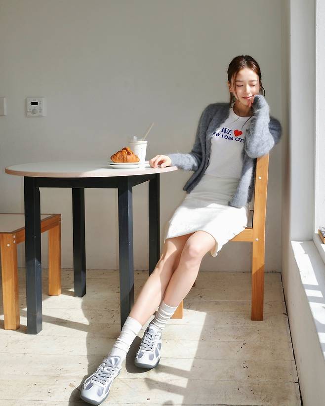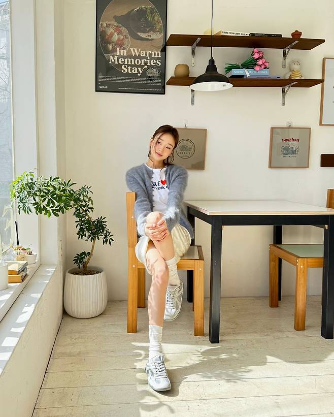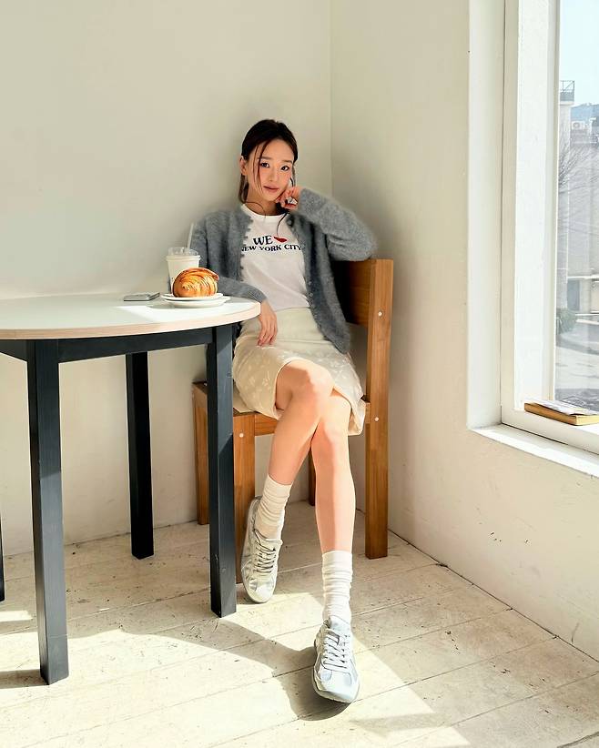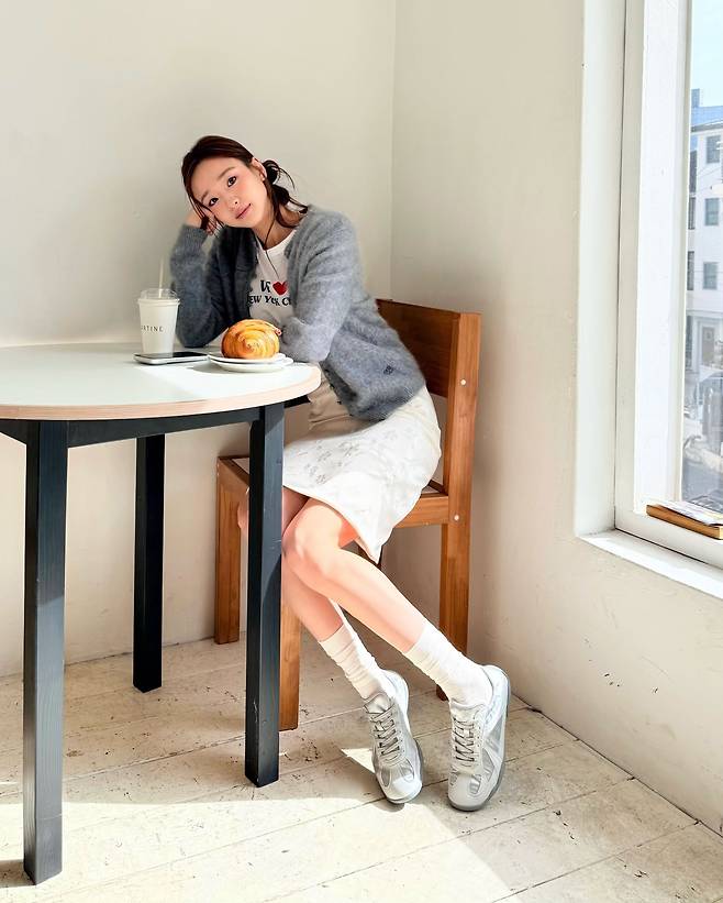 가디건의 단추를 가볍게 풀어 안의 하얀색 티셔츠를 드러낸 연출은 손연재 특유의 자연스럽고 여유로운 이미지를 잘 살려주고 있네요.