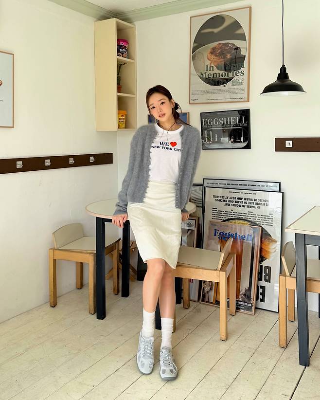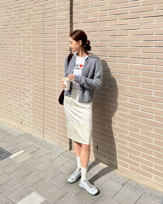 보송보송한 질감이 살아있는 회색 가디건을 메인 아이템으로 선택해서 시각적으로 매우 포근하고 부드러운 인상을 줍니다.