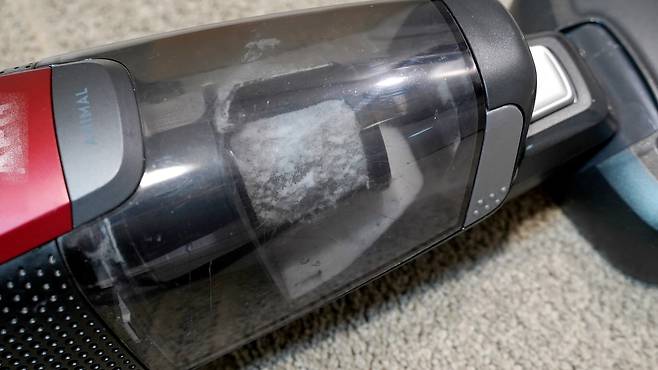 청소기 안을 보면 가루뿐만 아니라 각종 먼지와 털이 가득해진 것을 보실 수 있을 거예요.
