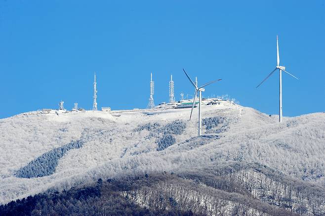 태기산(1,258m)은 강원도 횡성군과 평창군의 경계에 위치한 산으로, 겨울철 풍부한 적설량과 상고대(서리꽃)로 유명한 겨울 여행지입니다. 산 정상 부근에는 대규모 풍력발전기가 눈 덮인 설경과 어우러져 상당한 이국적인 풍경을 연출하죠.