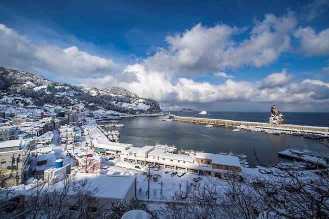 울릉도에서 가장 큰 항구인 저동항은, 겨울철에 눈 덮인 어촌의 고즈넉한 풍경이 상당히 낭만적으로 다가옵니다. 항구에 정박한 어선들과 주변의 산들이 눈에 덮여 만들어내는 설경은 마치 아이슬란드에 온 것만 같죠. 정말 너무나 아름답습니다.