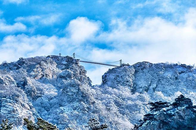 다리 중앙에는 가로 40cm, 세로 1m 크기의 강화유리 조망 창이 세 곳 설치되어 있어, 마치 하늘 위를 걷는 듯한 짜릿한 경험을 선사하는데요. 백아산은 기암괴석과 수려한 자연경관으로 유명하며, 겨울철에는 설경과 운해의 명소로 알려져 있죠.
