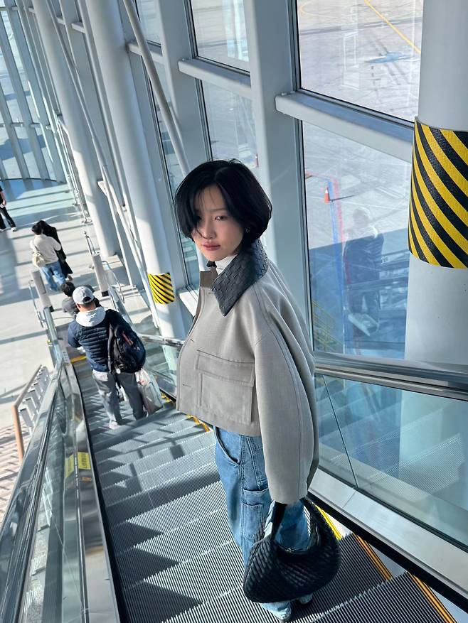 화사가 보여준 이번 스타일은 짧은 기장의 크롭 재킷과 와이드한 데님 팬츠를 매치해 활동성과 스타일을 동시에 잡은 힙한 겨울룩이에요.