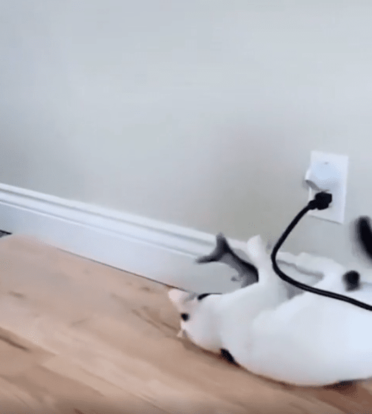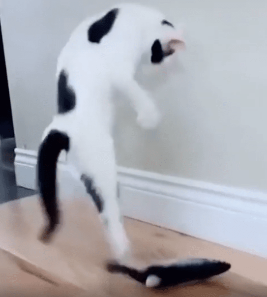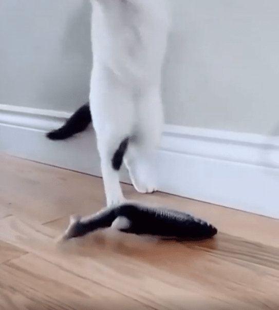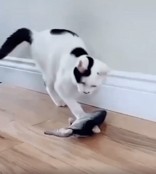 그다음 장면에선 물고기 장난감을 입에 물고, 앞발로 눌러놓은 채 마치 사냥감처럼 덮치는 고양이의 모습이 보입니다. 이젠 파닥거리는 움직임에도 전혀 놀라지 않고, 오히려 더 재미있다는 듯 물어뜯고, 발로 차고, 고개를 돌려 물고. 처음에는 도망치더니, 이제는 장난감과 한몸이 되어버린 듯한 몰입도입니다.