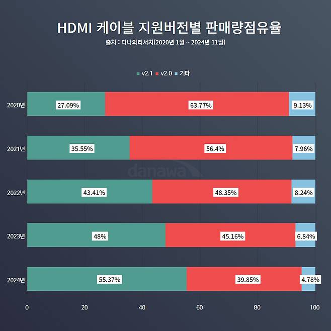 2020년엔 v2.0이 63.77%, v2.1이 27.09%로 v2.0이 과반을 넘는 상태였다. 하지만, 시간이 흐르며 v2.1의 점유율이 서서히 오르며 결국 역전에 성공했다. 2024년엔 v2.0이 39.85% v2.1이 55.37% 점유율로 분포되었다. 한번 역전된 버전별 판매량 점유율은 2025년에도 계속 비슷한 경향으로 진행될 것이라 예상된다. 새로운 기술이나 규격이 탄생했을 때에는 속도는 느리지만, 언젠가는 새 버전이 구 버전을 대체하기 마련이다. HDMI 케이블도 이미 v2.1이 v2.0의 점유율을 넘어서며 세대교체가 완료되었다고 간주할 수 있는 대목이다.