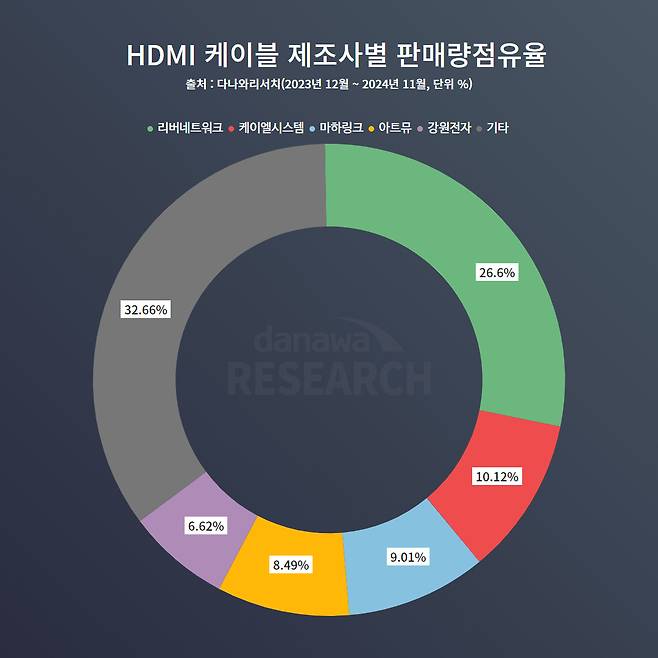 마지막으로 제조사별 점유율이다. 제조사별 점유율은 지난 4월과 마찬가지로 리버네트워크가 26.6%로 강세를 보이고 있다. 문제는 2, 3위권 싸움인데 현재는 케이엘시스템이 10.12%로 2위, 마하링크가 9.01%, 아트뮤가 8,49%로 각축전을 벌이고 있다. 지난 4월의 차트뉴스 작성 시 2위였던 이지넷유비쿼터스는 순위권에서 멀어진 상태다. 제품의 특성상 중소기업끼리 판매량 점유율 경쟁을 벌여야 하므로 순위 간 편차가 심하지 않은 편이다. 각 제조사들이 커넥터에 금 도금을 하거나 케이블 표면 쉴드 처리를 강화한 고급형 제품을 앞다투어 출시한 덕에 2025년에는 더욱 순위권 경쟁이 치열해질 전망이다.