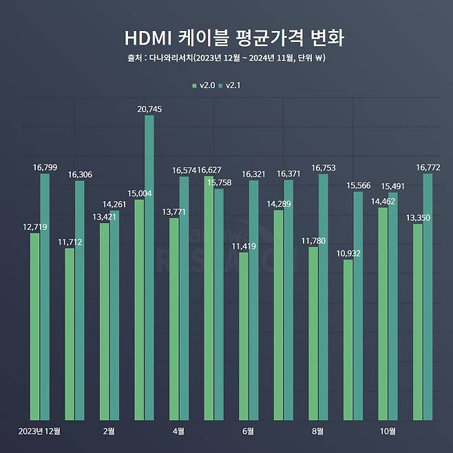 HDMI 케이블의 세대교체에는 평균 가격의 변화에서도 원인을 찾아볼 수 있다. 바로 구형인 v2.0과 신형인 v2.1 제품간 평균 가격 차이가 계속 줄어든다는 것이다. 2년 전부터 두 버전의 평균 가격 차이는 약 4천 원 정도로 심리적 부담감이 전혀 없었다. 하지만, 이 차이는 더욱 줄어들어 2024년 10월에 이르러서는 1천 원 미만까지 기록했다. 가격 차이도 별로 안 나는데 기왕이면 높은 버전의 케이블을 구매하는 게 소비자의 자연스러운 심리다.