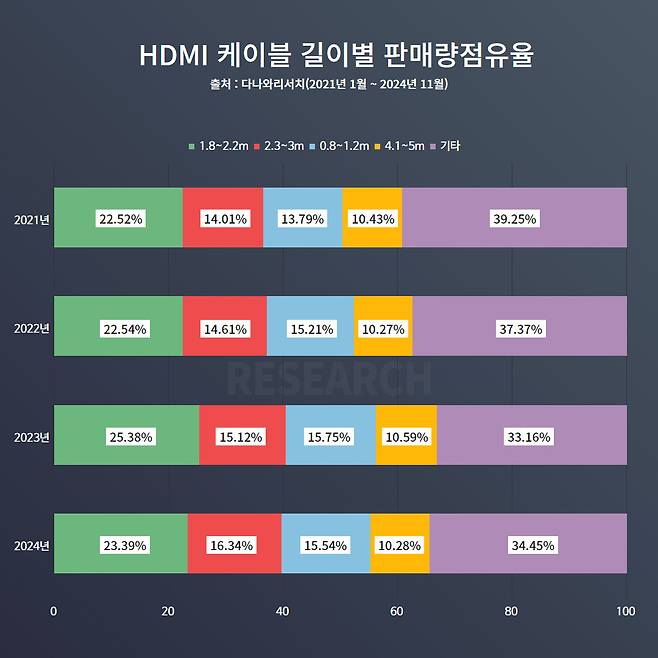 케이블을 고르는데 또 한 가지 중요한 요건은 길이다. HDMI 케이블은 1.8~2.2m 짜리 제품의 판매량 점유율이 가장 높다. 이는 2021년부터 계속 이어져 왔는데, 22.52%에서 23.39%로 소폭 상승했다. PC를 올려놓는 책상의 길이, 높이를 감안하면 약 2m 세팅이 가장 적합한 길이이기 때문에 HDMI 케이블 판매량 점유율에도 반영된 것이라 할 수 있다. 같은 환경에서 PC를 책상 밑에 놓는다든지, 모니터암을 사용해 연결하는 특수한 환경에서는 바로 윗단계인 2.3m~3m짜리 제품이 적절하다. 이를 증명하듯이 2.3~3m HDMI 케이블의 판매량 점유율은 3년 새 2% 정도 소폭 상승한 모습이다. 더불어 반대의 상황, 즉 노트북과 서브 모니터만 책상 위에서 간편히 연결할 목적인 0.8m~1.2m 짧은 케이블도 판매량이 소폭 올라 3위에 랭크되었다.