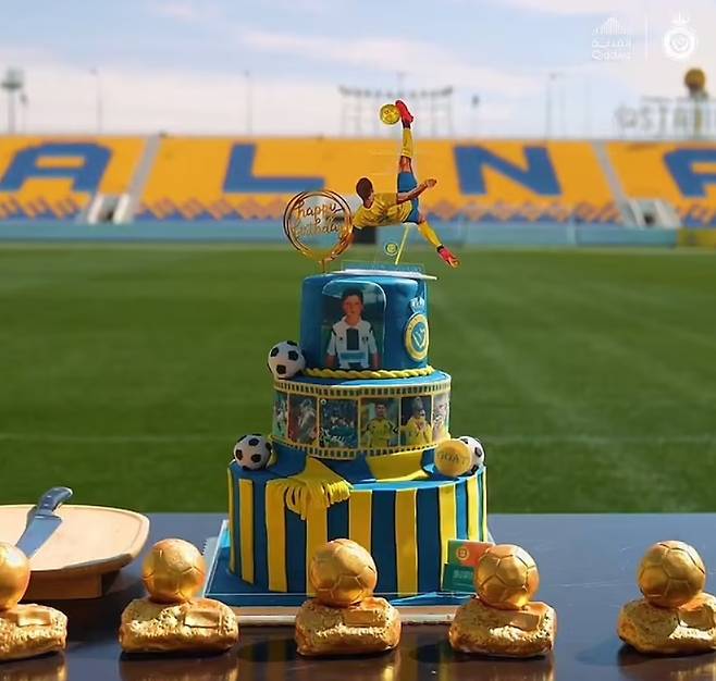 이게 바로 '연봉 3000억' 호날두 40세 축하 '사우디 부자구단' 특별 케이크…발롱도르 5개 과자 '눈에 띄네'