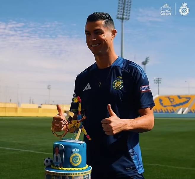 1985년생 호날두는 생일인 2월 5일이 되면서 어느덧 만 40세가 됐다. 호날두가 생일을 맞이하자 그의 소속팀 알나스르는 특별한 케이크를 준비했다. 호날두는 알나스르에서 연봉 2억 유로, 3000억원을 받는다.