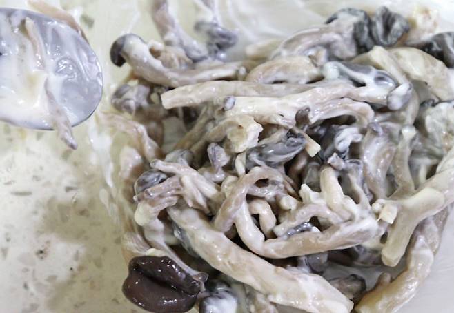 이렇게 만든 느타리버섯 검은깨 샐러드 버섯무침 한식집에서 나오는 버섯의 쫄깃한 식감에 검은깨와 마요네즈 드레싱으로 고소함 폭발이에요.