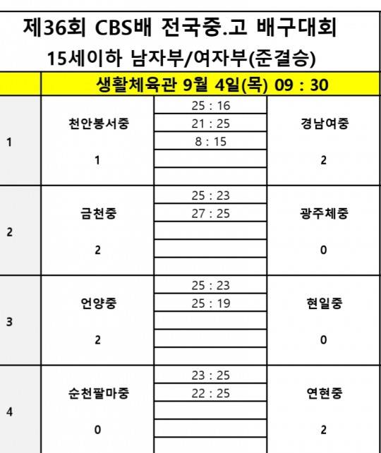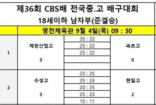 한편 18세이하 남자부 준결승에선 6월 익산보석배 대회 우승팀 제천산업고가 속초고를 3-0(25-22, 25-22, 25-22)으로 완파하고 결승에 진출했다. 수성고도 7월 IBK기업은행배 우승팀 구미 현일고를 3-2(23-25, 25-23, 20-25, 25-23, 15-11)로 꺾고 제천산업고와 결승서 맞붙게 됐다.