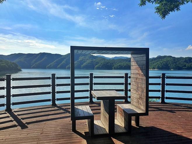 출발은 망향의동산에서 시작합니다. A코스(9km)는 세 곳의 전망대를 지나며 호수와 물그림자가 어우러진 풍경을 감상할 수 있고, 곳곳에 조형물이 있어 쉬엄쉬엄 사진 찍기 좋습니다.