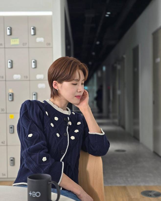 사진 속 장도연은 플라워 패턴이 새겨진 남색 가디건을 입고 꽃다운 미모를 뽐내고 있습니다.