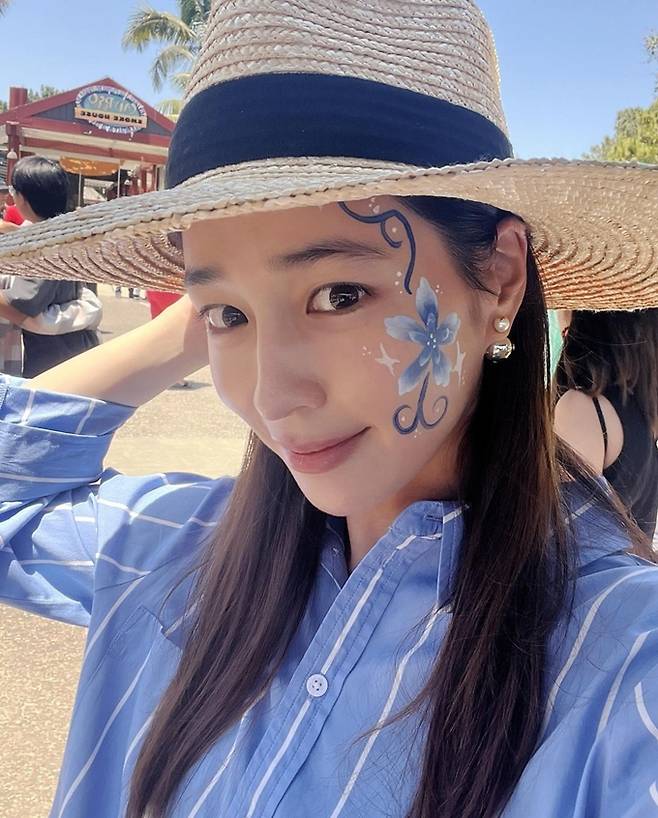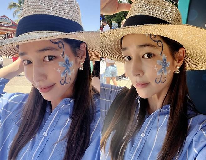 배우 이민정이 스트라이프 셔츠와 딱 맞춘 얼굴 페인팅으로 초동안 섬머룩을 완성했다.