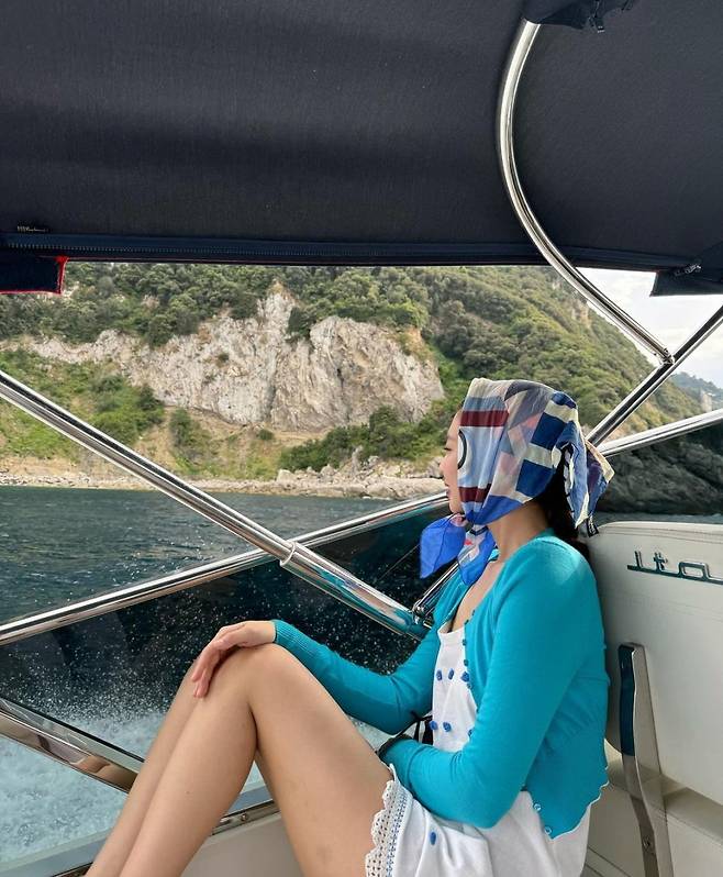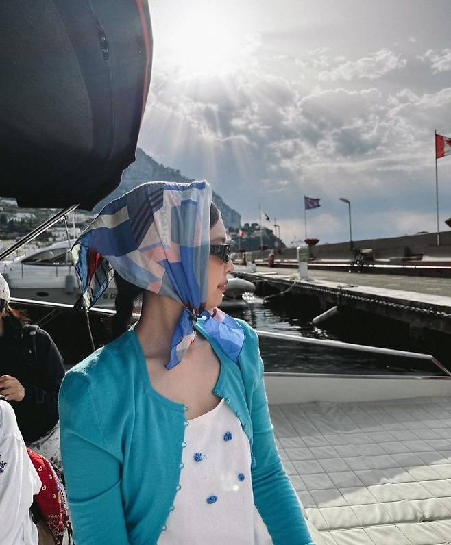그녀의 밝고 상큼한 색감의 룩은 보는 이에게 신선한 느낌을 주며, 여행지에서의 여유로운 분위기를 잘 표현했는데요. 이 스카프의 가격대는 약 50만원대 정도 입니다.