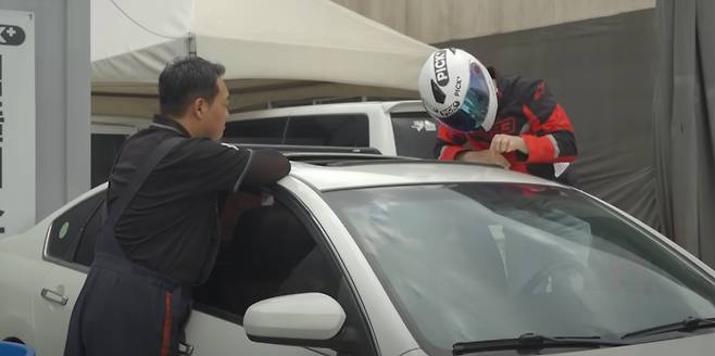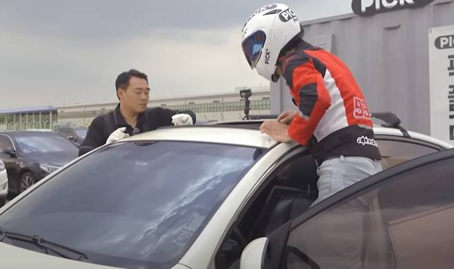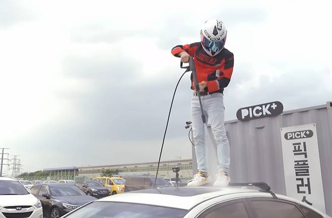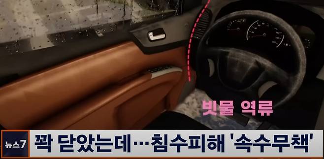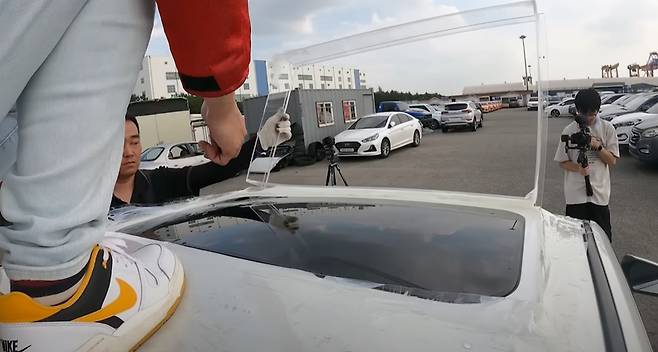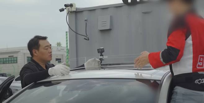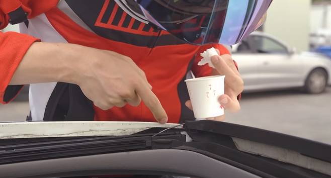 본격적인 실험에 앞서, 정상적인 선루프에서도 물이 들어갈 수 있는지 확인해보았습니다. 차량 지붕에 올라가서 고압수로 선루프를 향해 쏴 본 후 썬루프를 열어 보았습니다