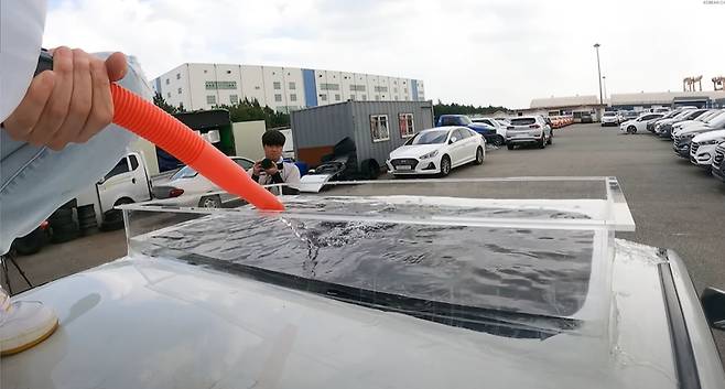 본격적인 실험을 위해 썬루프의 배수구멍을 막은 후, 물 낭비를 줄이기 위해 특수 제작한 수조를 차량 지붕위에 올리고, 물을 채운 후 실험을 하도록 하겠습니다.